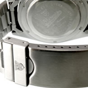 腕時計のベルトは三つ折れのダブルロックタイプ。