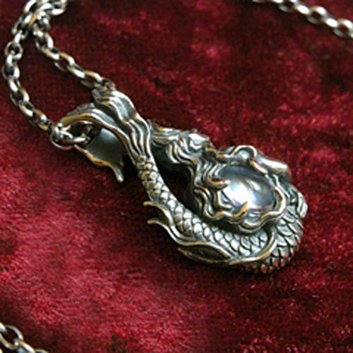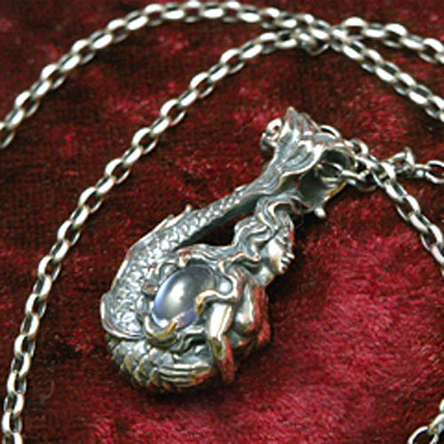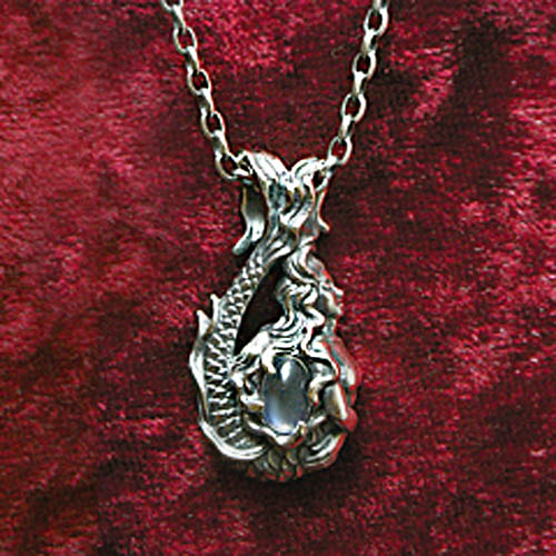 人魚をイメージした、小ぶりで着けやすいペンダント。全体のフォルムも、水を連想させるしずくの形をしています。流れる髪から覗く、ブルームーンストーンの淡く青い色合いが幻想的です。