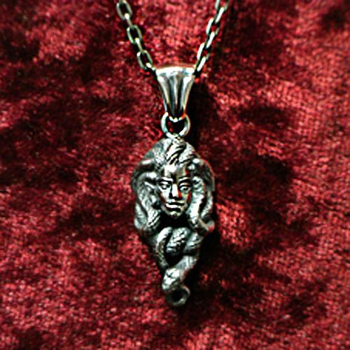 Medusaシリーズで最小のペンダントトップ。かなり小さいですが、妖艶な表情は健在です。よく見ると片耳にピアスがついているのが、Guardia好きにはたまらない(はず)。さりげなく着けられながらも、個性をアピールできるアイテムです。
