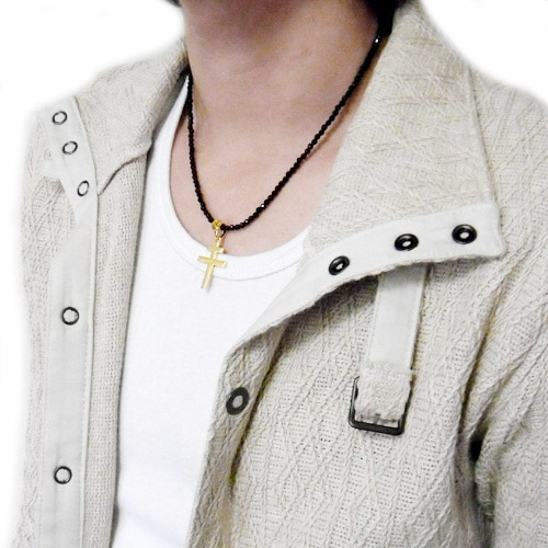 ネックレスチェーンにはオニキスの天然石を用いることで、トップのゴールドと相まって“高級感“さえ感じさせる。