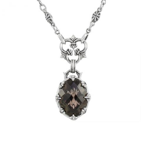 スモーキークォーツに透かしが浮かぶ凝ったデザインに加え、ペンダント裏やバチカンはユリとトレサリーデザインを彫り込んだ繊細な作りに。