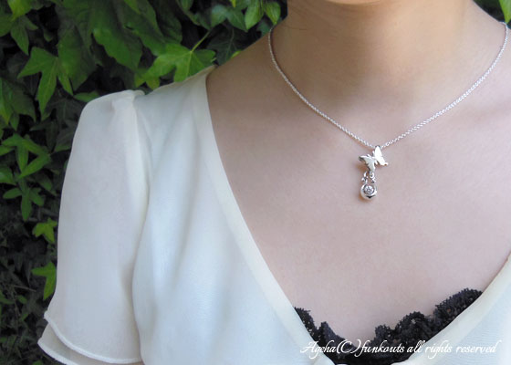 アゲハ蝶のシルエットがスタイリッシュにデザインされたトップと月をモチーフにした石枠を組み合わせたペンダントです。月の枠にセットされた「ダンシングストーン」はたえずキラキラと輝いて首元を美しく飾ります。